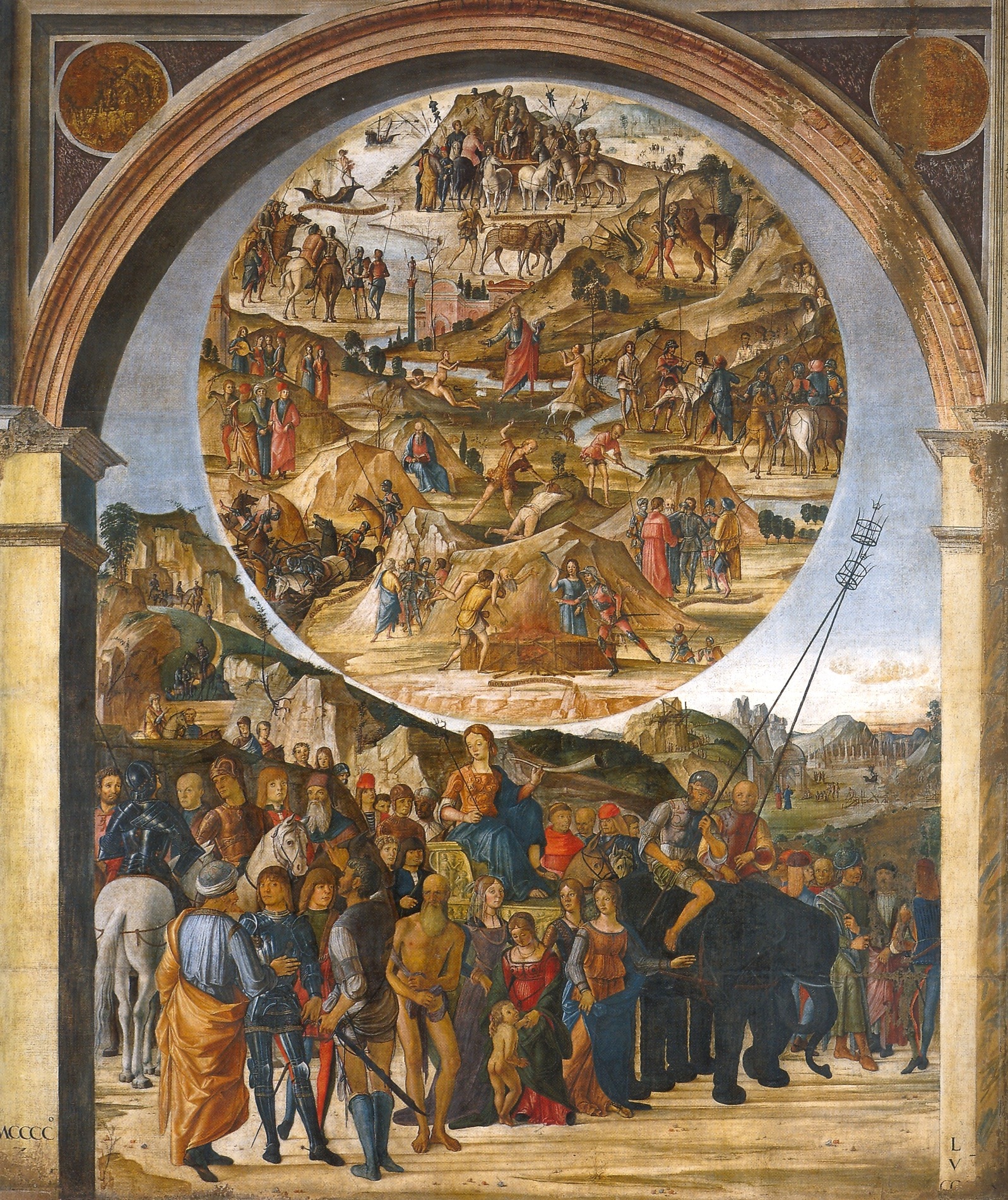 All'interno troviamo, oltre alla Biblioteca e agli uffici, le collezioni dei musei universitari, che meritano senz'altro una trattazione a parte. Proseguendo in sù, in direzione torri, ritroviamo il Teatro Comunale, costruito da Antonio Bibiena nel luogo ove un tempo sorgeva la Domus Aurea, ovvero il celebre Palazzo voluto da Giovanni II Bentivoglio e distrutto dopo la cacciata della famiglia nel 1507. Pietro Lamo non ebbe il tempo di vederlo; tuttavia ricorda quello che si trovava e si trova ancora oggi proprio lì davanti: “a ma sinistra, su la piacia de li Bentivoglio, v'è una logia in volta a basso che serve per portigo, sostenuto da colone e sopra ne la faciata vi sono figure a fresco”: quello che erano, scuderie, ancora lo sono, almeno nel nome. E poco dopo “al salire del principio sotto sotto il portico di San Jacomo, a man sinistra è la gisiola si Santa Cecilia, e quivi è tutta dipinta atorno de capitoli, a fresco, de man de vari maestri a concorencia l'un de l'altro”. Ancora oggi possiamo ammirate l'operato di questi maestri, ovvero i pittori di corte ingaggiati da Giovanni Bentivoglio per ornare l'oratorio di Santa Cecilia (oggi il n. 15): Francesco Raibolini detto Francia, Lorenzo Costa, Amico Aspertini ed altri realizzarono tra il 1505 ed il 1507 una meravigliosa decorazione a fresco con le storie di Cecilia e Valeriano, capolavoro assoluto della pittura bolognese del Rinascimento. L'entrata dell'oratorio è situata all'inizio del magnifico porticato che corre lungo il lato sinistro della chiesa di San Giacomo: questa splendida successione di colonne scanalate, pulvini sovrapposti a capitelli in arenaria scolpita ed eleganti arcate – eseguita tra il 1478 ed il 1481 dal lapicida Tommaso Filippi da Varignana con fregi di Sperandio da Mantova – è senza dubbio una delle massime espressioni dell'architettura rinascimentale bolognese. Questo capolavoro è addossato ad un altro, immenso e superbo, il Tempio di San Giacomo Maggiore, uno scrigno strapieno di gioielli, soprattutto di pale d'altare di pittori bolognesi del Cinquecento. Tra gli innumerevoli capolavori (di cui parleremo in un articolo a parte) è un delitto mancare la superba Cappella Bentivoglio, massimo esempio della cappella gentilizia quattrocentesca bolognese: innalzata nel 1445, fu ampliata ed ornata di preziose pitture da Giovanni II Bentivoglio alla fine del secolo; oltre che della magistrale pala d'altare eseguita dal Francia nel 1494, essa è contenitore delle gigantesche tele con il Trionfo della Fama [fig.2] ed il Trionfo della Morte di Lorenzo Costa. Su piazza Rossini, inoltre, si affaccia lo splendido Palazzo Magnani (oggi Unicredit Banca, al n.20), architettato tra il 1577 ed il 1590 da Domenico Tibaldi, nel quale è possibile visitare (a richiesta) lo splendido salone nel quale Annibale, Agostino e Lodovico Carracci realizzarono (1588-1591) ad affresco un fregio di oltre 25 metri con le storie della fondazione di Roma [fig.3]. I gioielli dell'ex Stratha sancti Donati non finiscono qui: tuttavia non possiamo continuare per ragioni logistiche: ci saranno altre occasioni per parlare di Palazzo Malvezzi Campeggi (n.22) e di Palazzo Solaroli (n.25), o ancora di Palazzo Malvasia (nn.14-16), Bianchetti (n.9) o Malvezzi de Medici (n.13). In conclusione lancio un'idea: istituiamo nuovamente la figura dell'”acclamatore”; quello che, quando nacque il cinematografo alla fine dell'Ottocento, presentava a gran voce l'innovativo spettacolo invitando la gente che passava lì davanti a partecipare. Potrebbe sembrare provocatorio, ma una proposta intelligente, ed anche la piu' ovvia, potrebbe essere quella di stipendiare (dopo un breve corso di formazione) i più volonterosi ragazzi di Piazza Verdi trasformandoli da sconsolati disoccupati in accattivanti acclamatori, o ancor meglio in guide turistiche. Sicuramente un'utopia (prodotta dalla mia ingenuità fanciullesca); ma sognare è meraviglioso!